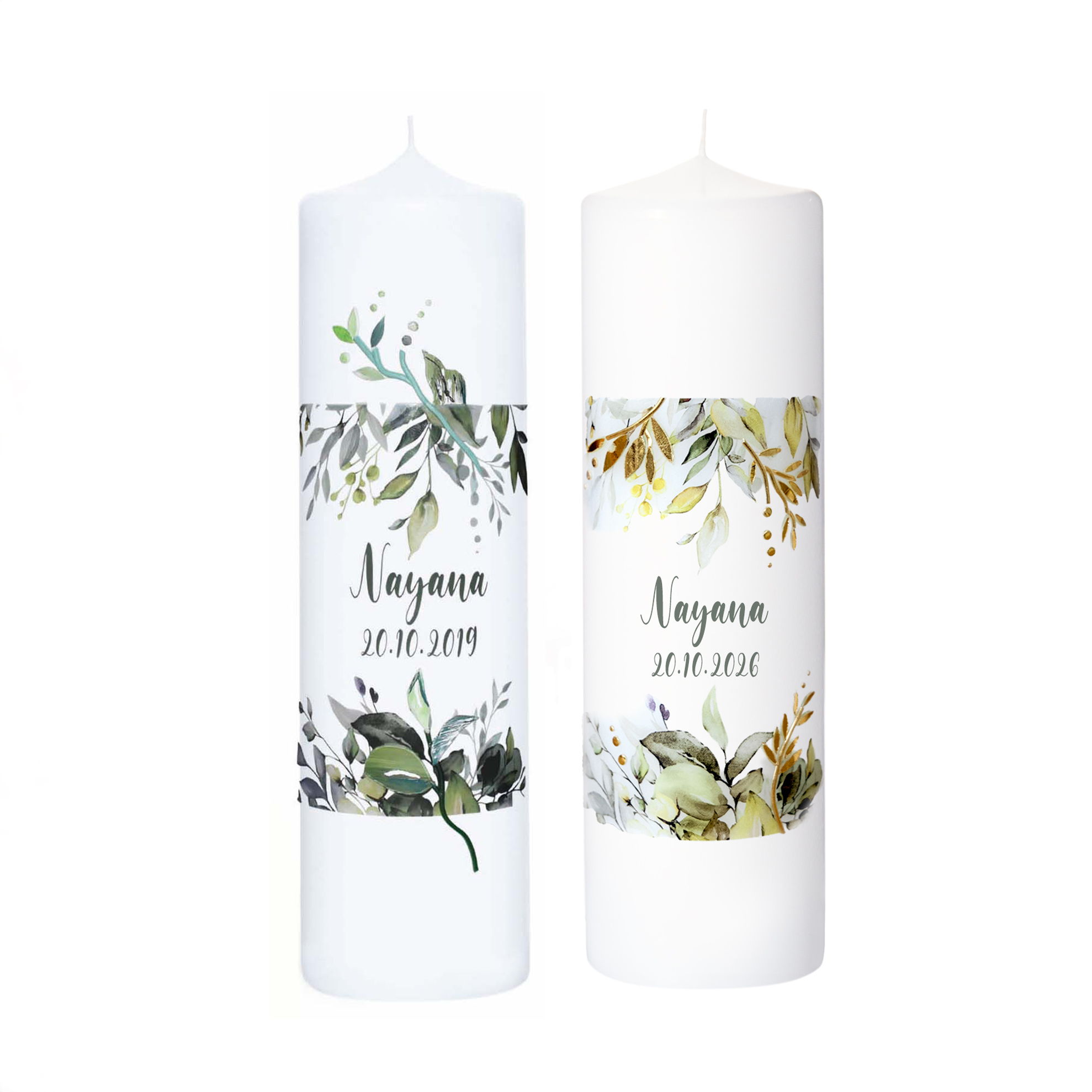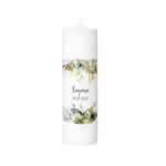 Taufkerze 70x200mm weiss. Details mit Blattwachs verziert.